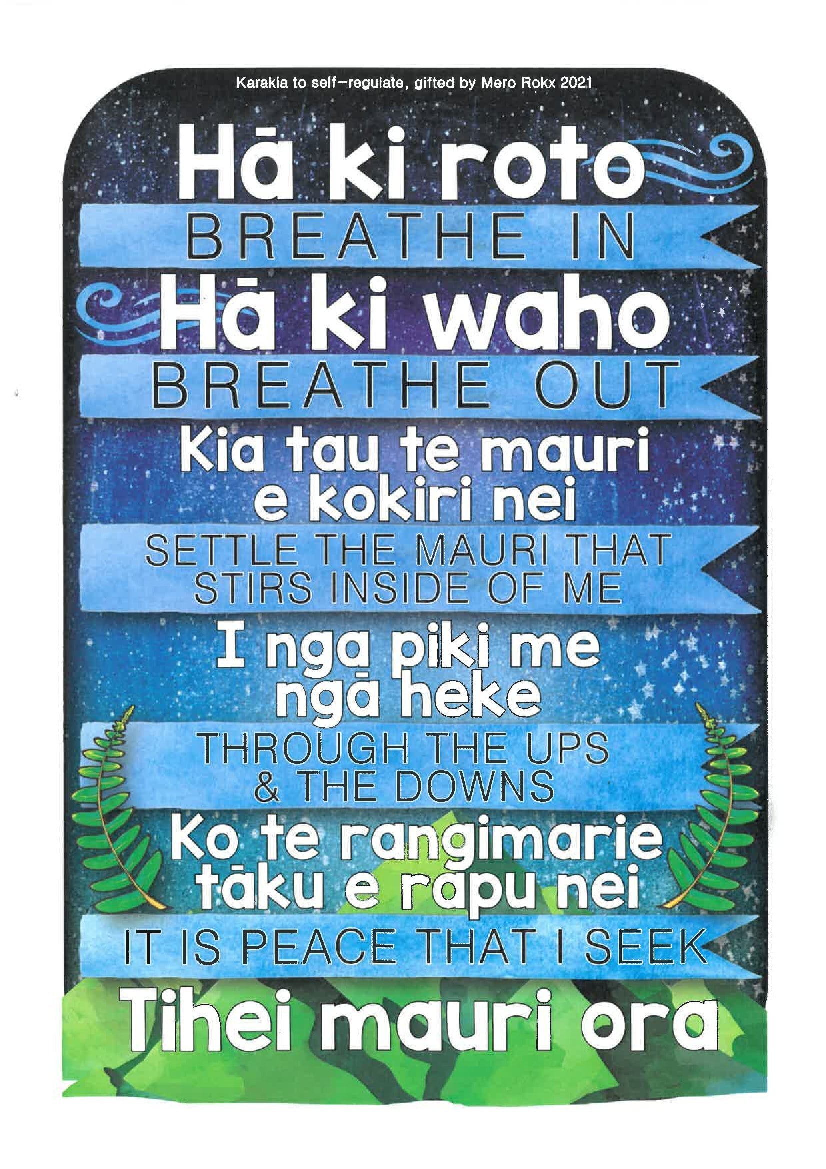 Finally, I want to share with you our morning blessing. It was written and gifted by Mero Irihapeti in 2021 especially to support the daily self-regulation of our tamariki. Simple breathing exercises can often calm the essence of our children enough for them to move on positively to a new day. Use this at home, your children are familiar with it and can teach you and show you how we do it together.